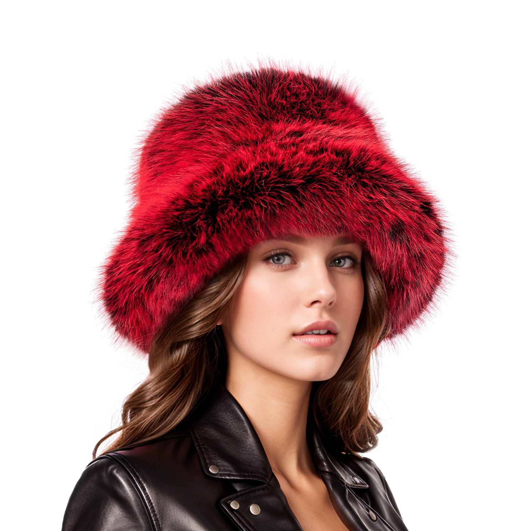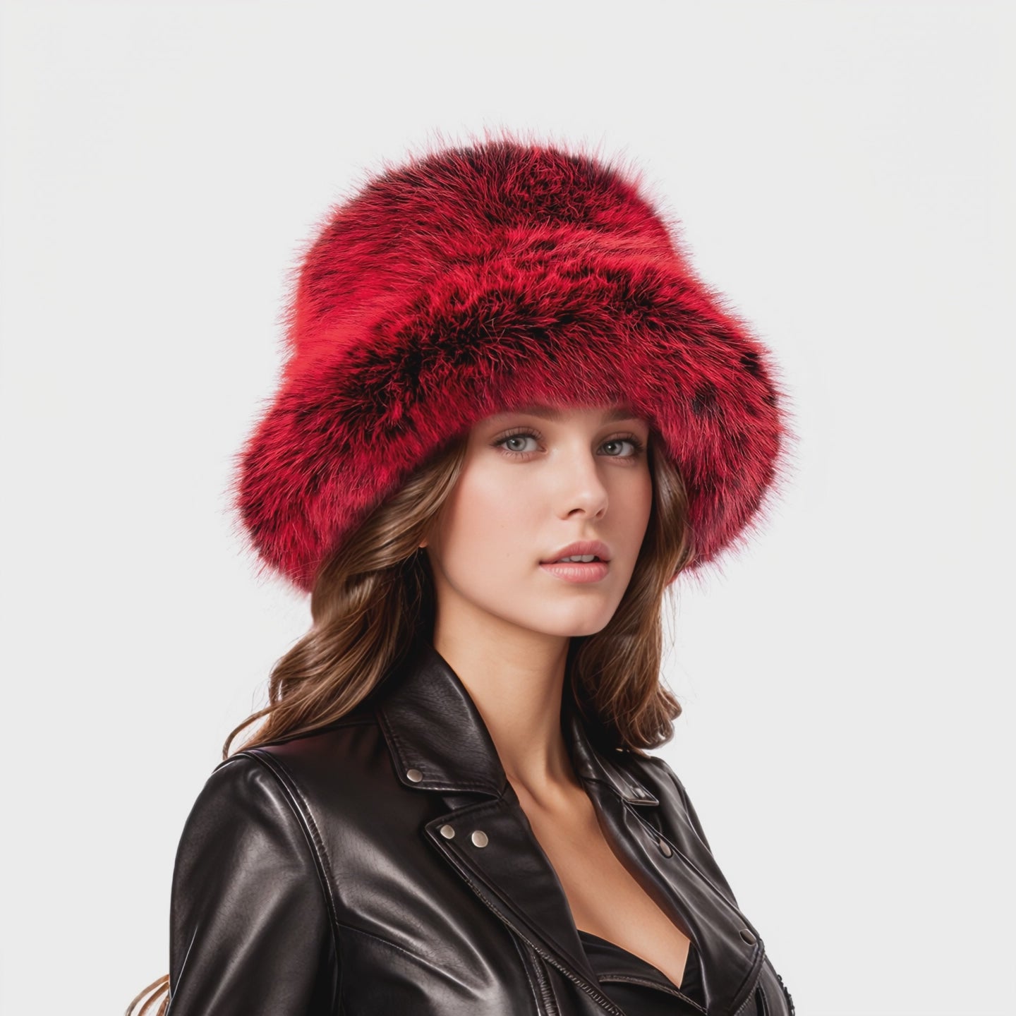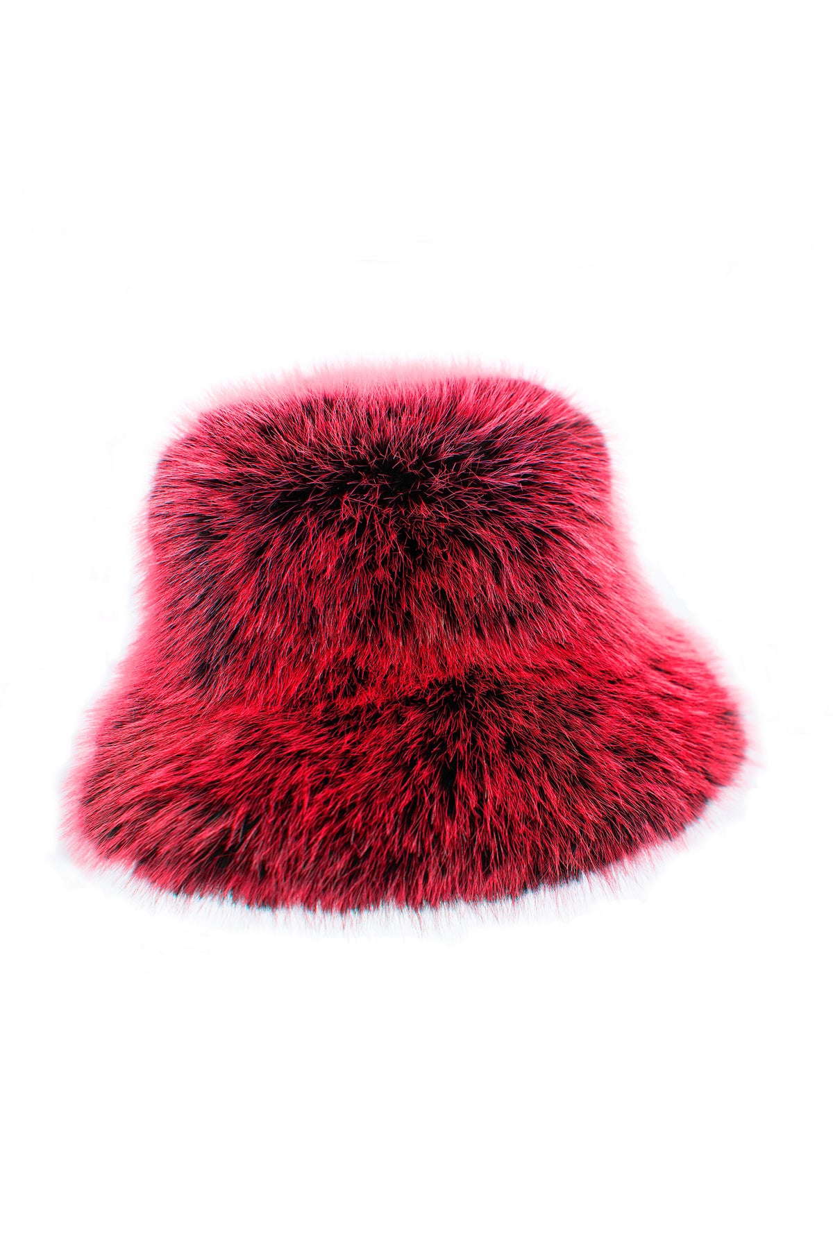 Faux fur bucket hat in black color with red tips. Made of fluffy and soft vegan fur. The head circumference is 58cm, which fits most of people.