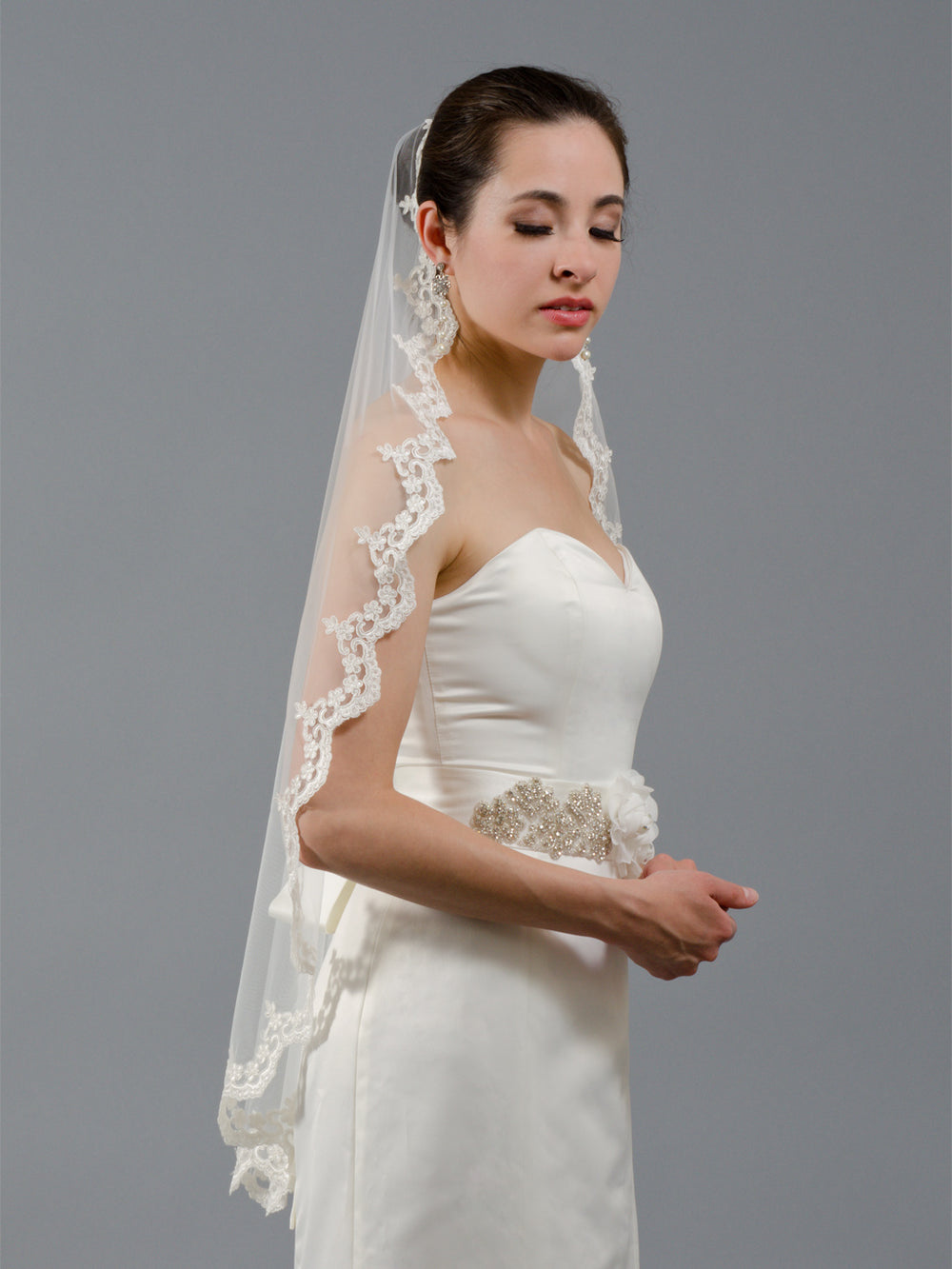 This is a beautiful lace mantilla veil. It features a 3" beautifully embroidered Alencon lace edge. Available in ivory. This veil is made of soft bridal illusion material that allows the veil to drape beautifully. A metal comb is attached to the veil for easy positioning. This veil is great for a wedding mantilla look, sure to make any bride feel beautiful on her special day.