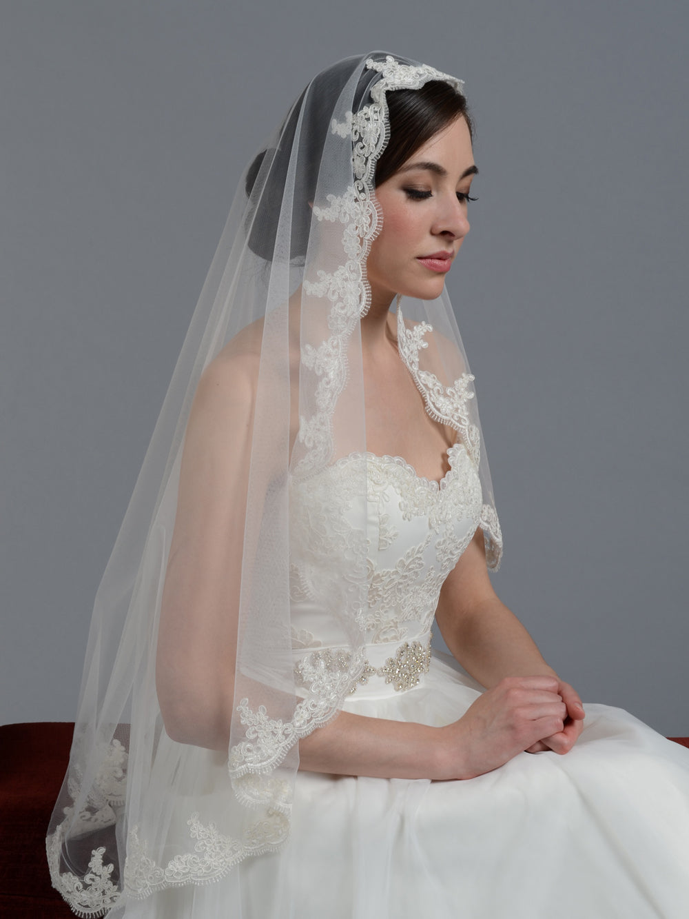 Bridal Mantilla veil elbow alencon lace V027e white/ivory