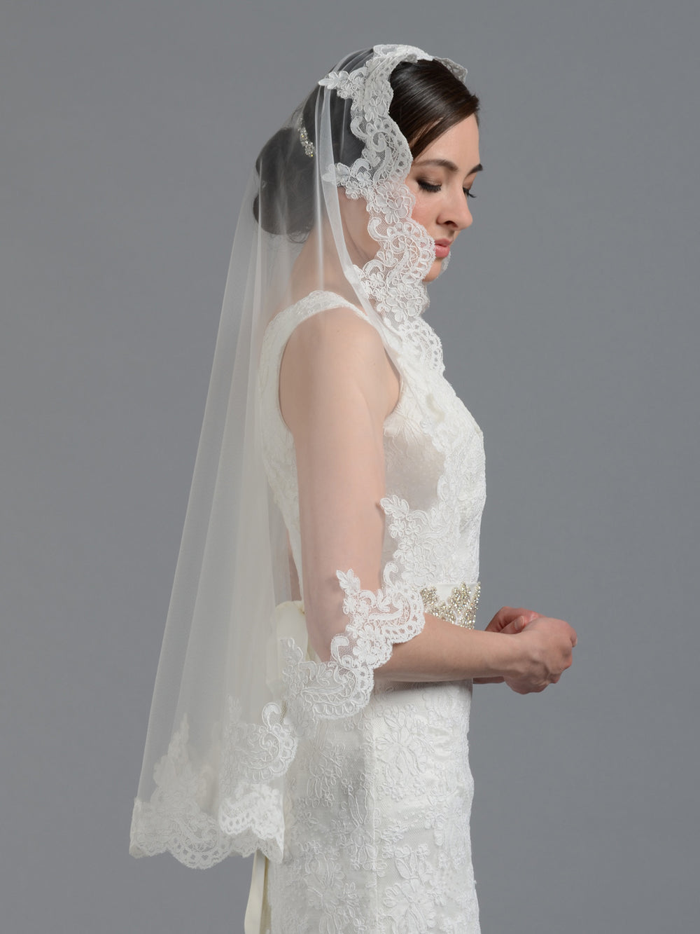 This is a beautiful lace mantilla veil. It features a 3" beautifully embroidered Alencon lace edge. This veil is made of soft bridal illusion material that allows the veil to drape beautifully. A metal comb is attached to the veil for easy positioning. This veil is great for a wedding mantilla look, sure to make any bride feel beautiful on her special day. The veil in the pictures is in light ivory color and show an elbow length veil.