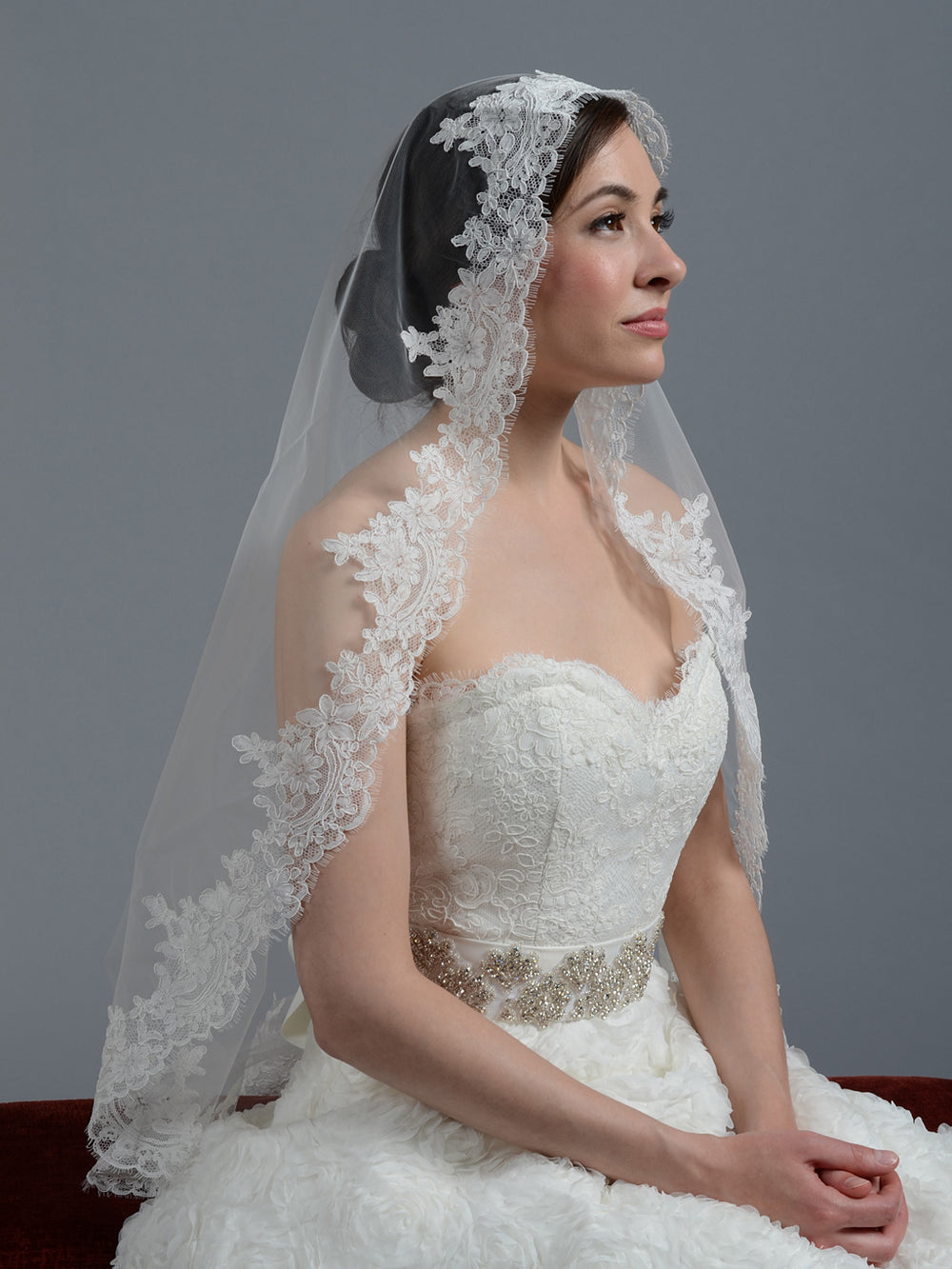 This is a beautiful lace wedding veil. It features a 4" beautifully embroidered Alencon lace edge, with delicate eye lashes. The second picture shows the detail of the lace. The color of the veil is ivory. This veil is made of soft bridal illusion material that allows the veil to drape beautifully. A metal comb is attached to the veil for easy positioning. This veil is great for a wedding mantilla look, sure to make any bride feel beautiful on her special day. Please note this veil is made to order and the lead time is 3 to 4 weeks.
