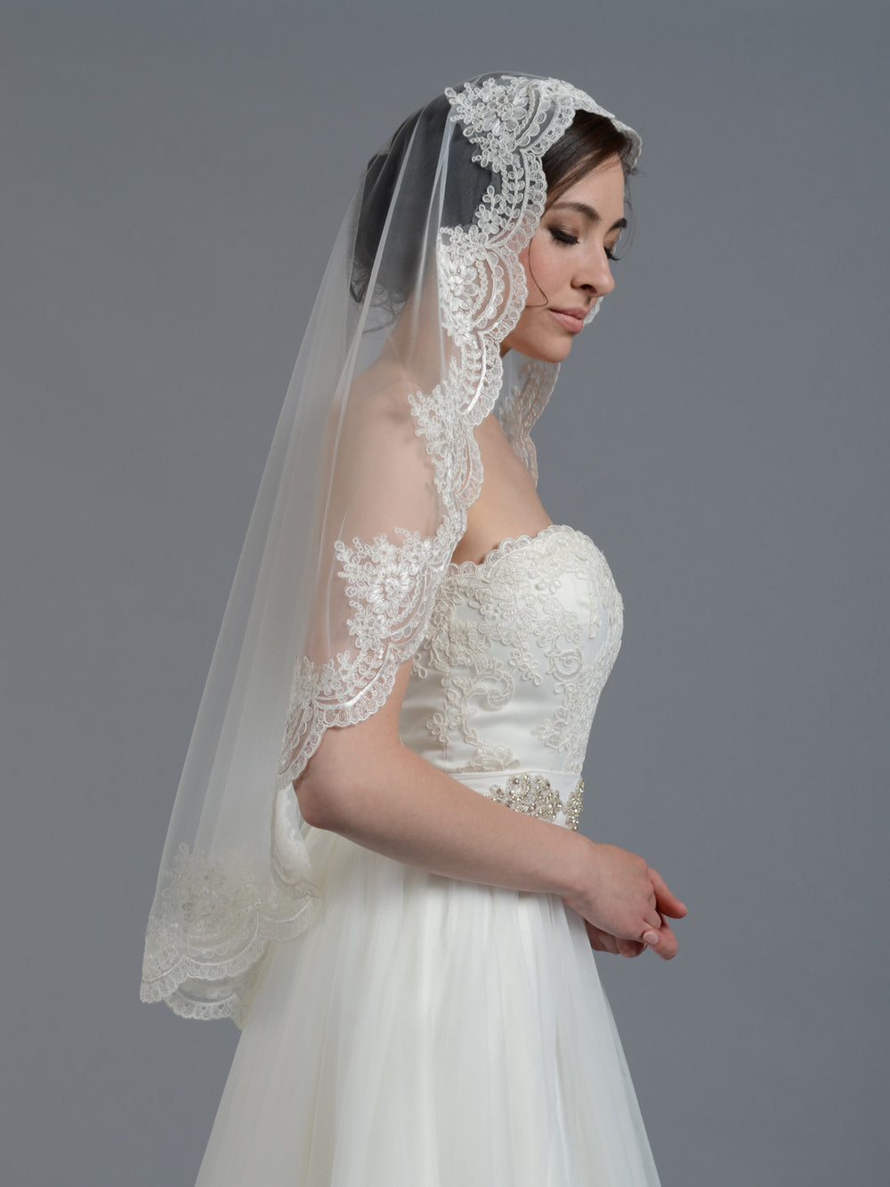 This is a beautiful lace mantilla veil. It features a 4" beautifully embroidered Alencon lace edge, with delicate eye lashes. Available in light ivory color and ivory color with yellow tone. This veil is made of soft bridal illusion material that allows the veil to drape beautifully. A metal comb is attached to the veil for easy positioning. This veil is great for a wedding mantilla look, sure to make any bride feel beautiful on her special day. The pictures show an elbow length veil.