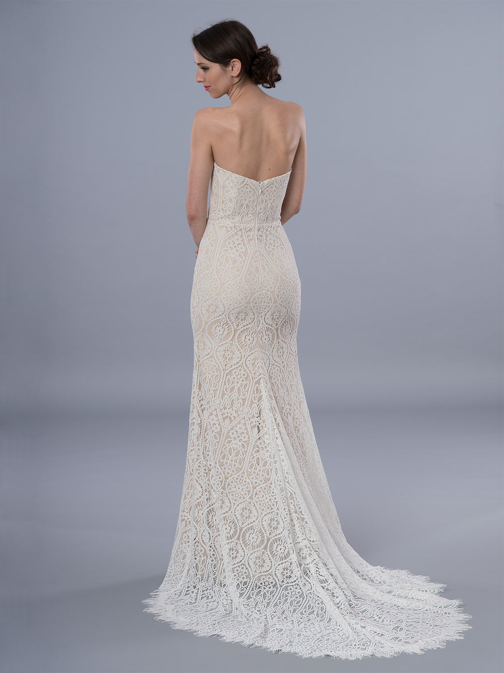 Strapless top and fit and flare skirt. Ivory soft lace over beige stretch satin lining.