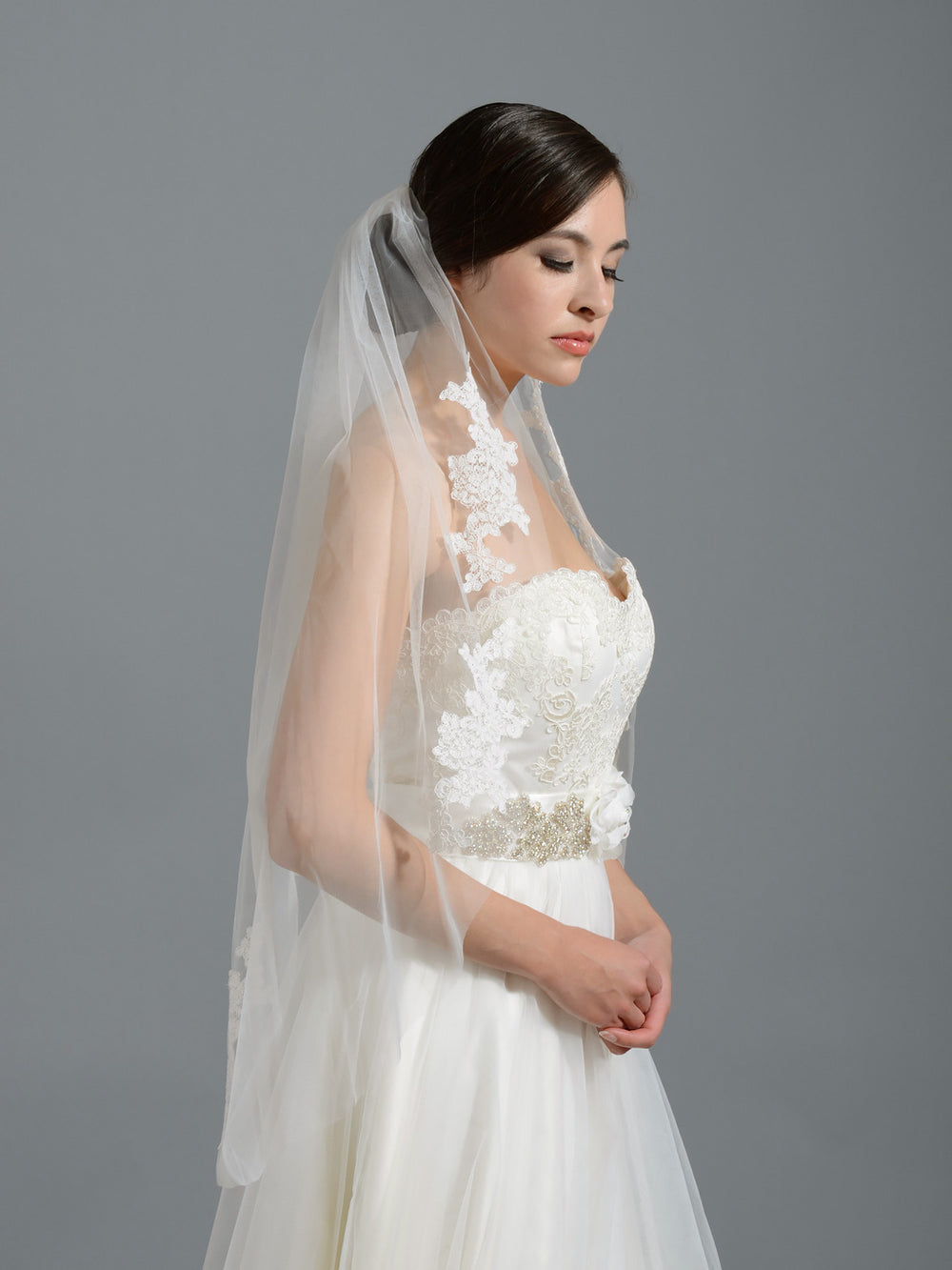 This is a beautiful wedding veil with alencon lace applique.The color of the veil is ivory and the size is 36" long. This veil is made of soft bridal illusion material that allows the veil to drape beautifully. A metal comb is attached to the veil for easy positioning.