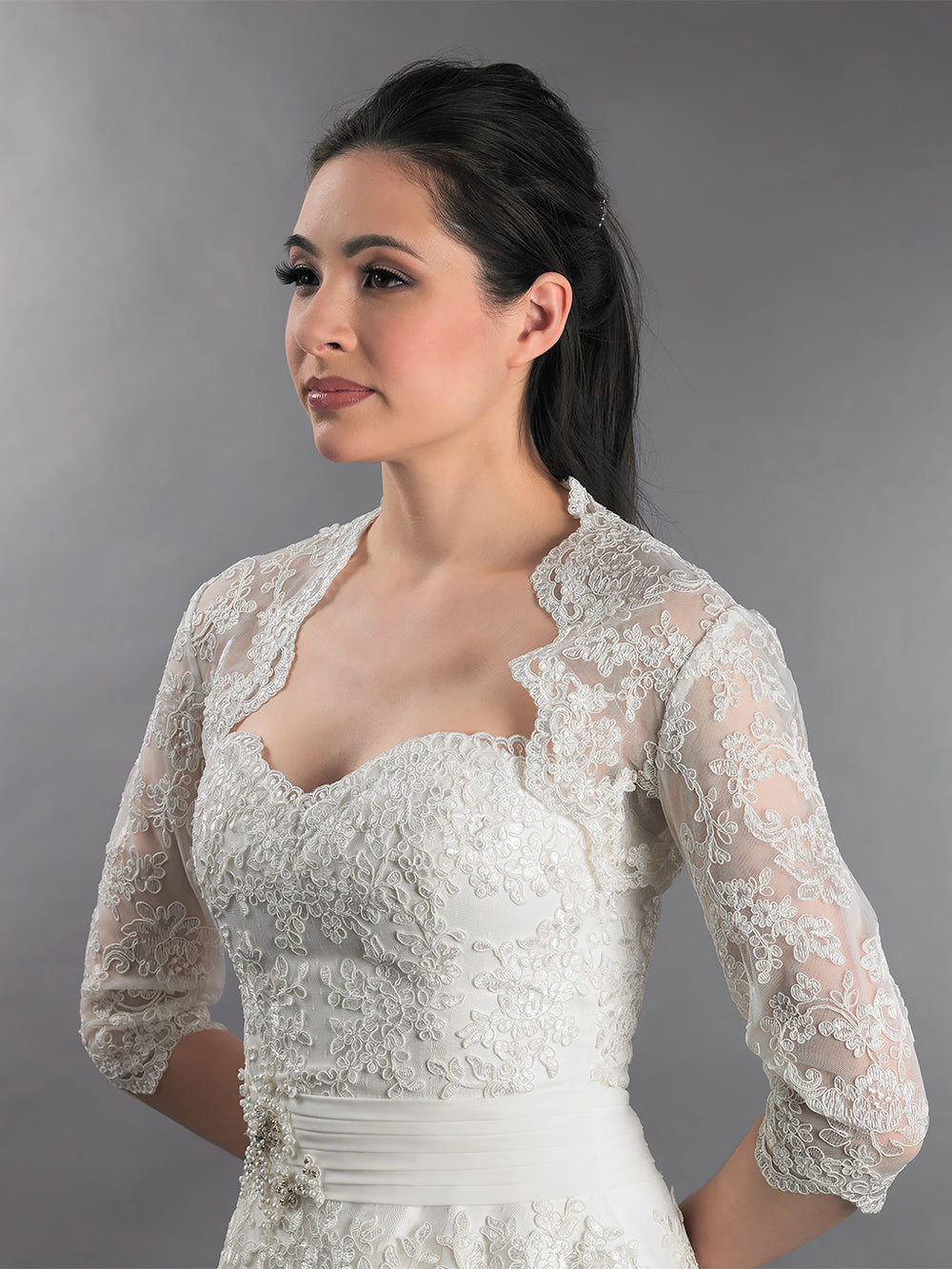 This is a 3/4 length sleeve wedding bolero jacket made of re-embroidered lace. Available in ivory color.