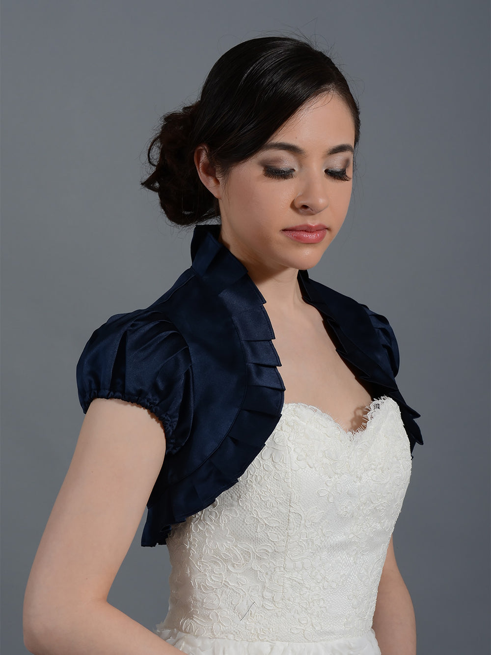 This is a Navy Blue puff short sleeve satin bolero jacket made of bridal satin with ruffled edges.