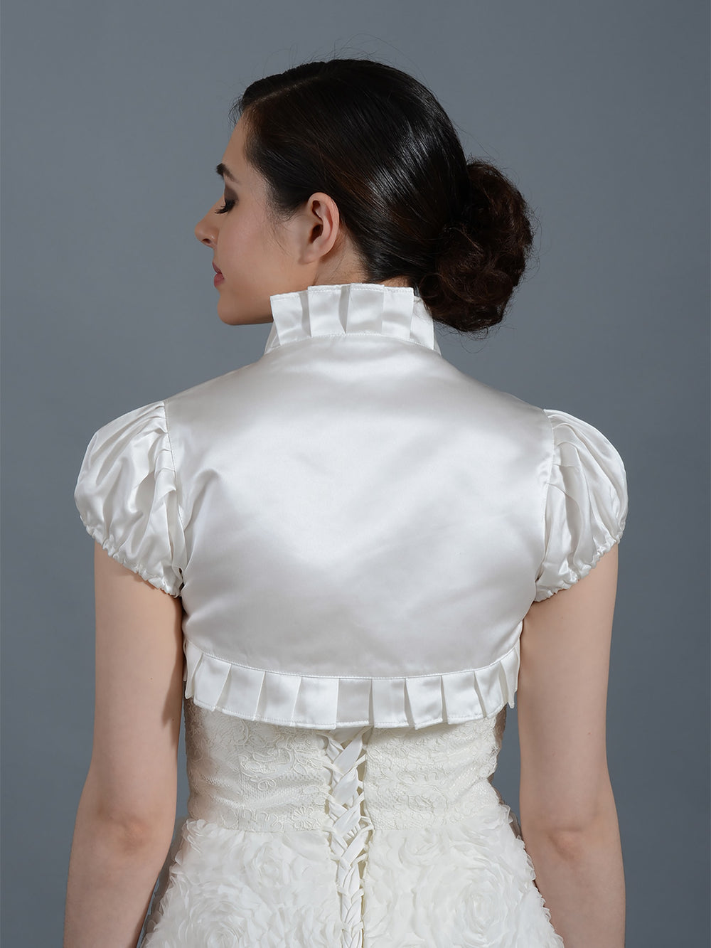 This is an off-white puff short sleeve satin bolero jacket made of bridal satin with ruffled edges.