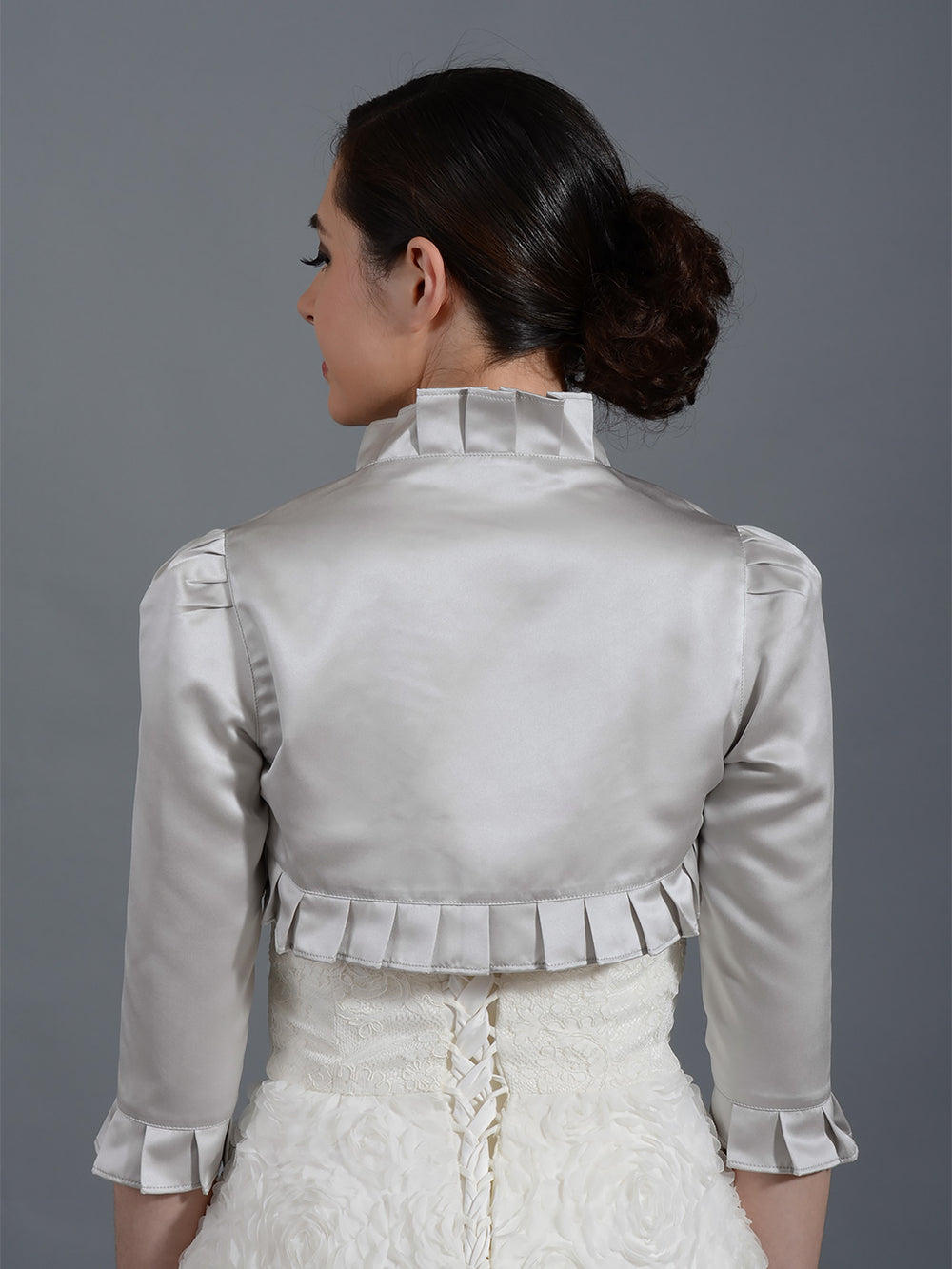 This is a silver color puff 3/4 sleeve satin bolero jacket made of bridal satin with ruffled edges.