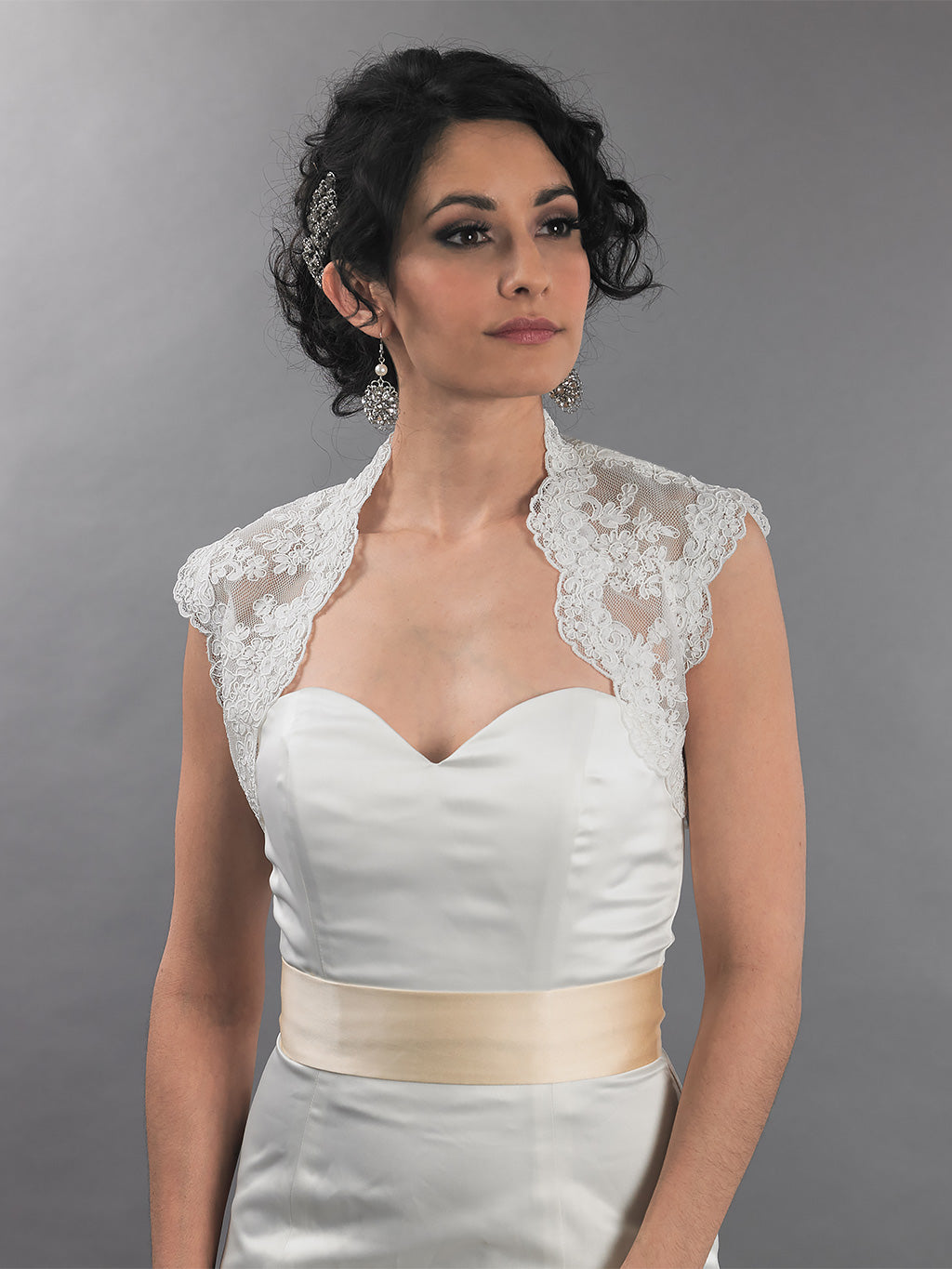This is a sleeveless bridal lace bolero jacket made of alencon lace. Available in ivory and white. The pictures show the ivory bolero.