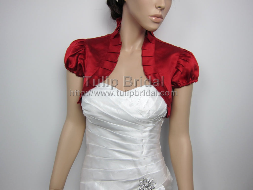 This is a wine red puff short sleeve satin bolero jacket made of bridal satin with ruffled edges.